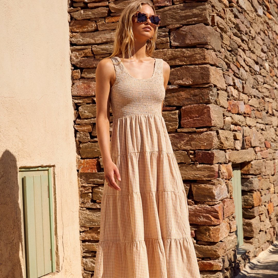 J’adore les vacances ! Inspired by the French Riviera, its champagne (or fresh strawberries and cream) day everyday in our Paris Dress in Sesame Gingham.